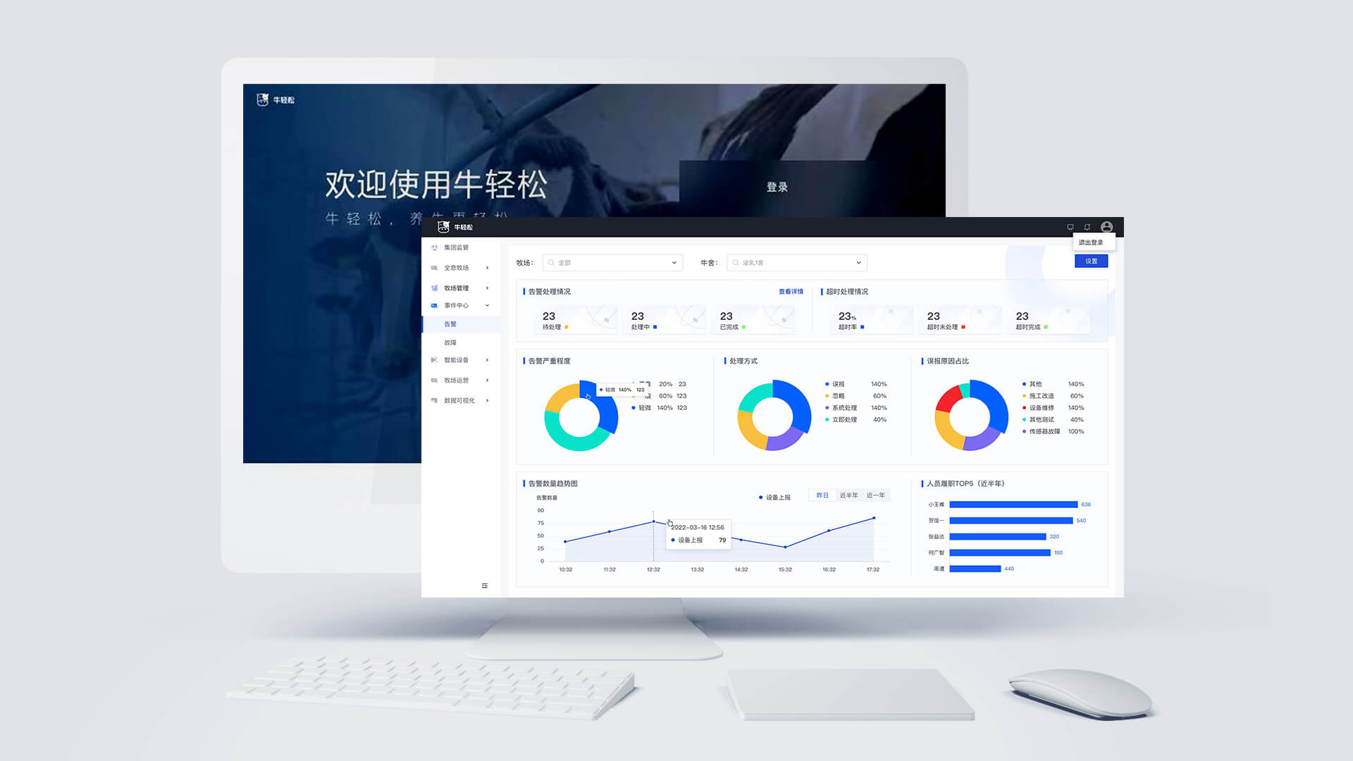 牛輕松對牧場的智能風機系統、噴淋系統、視頻監控系統、智能照明系統、能源監測系統、環境監測系統、工單系統等進行統一的管理與聯動配置。產品的應用實現牧場內所有設備的一鍵全連、協同聯動及可視化管理,輔助牧場能夠綠色的、高效的、可持續盈利的長足發展。